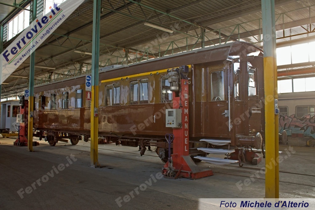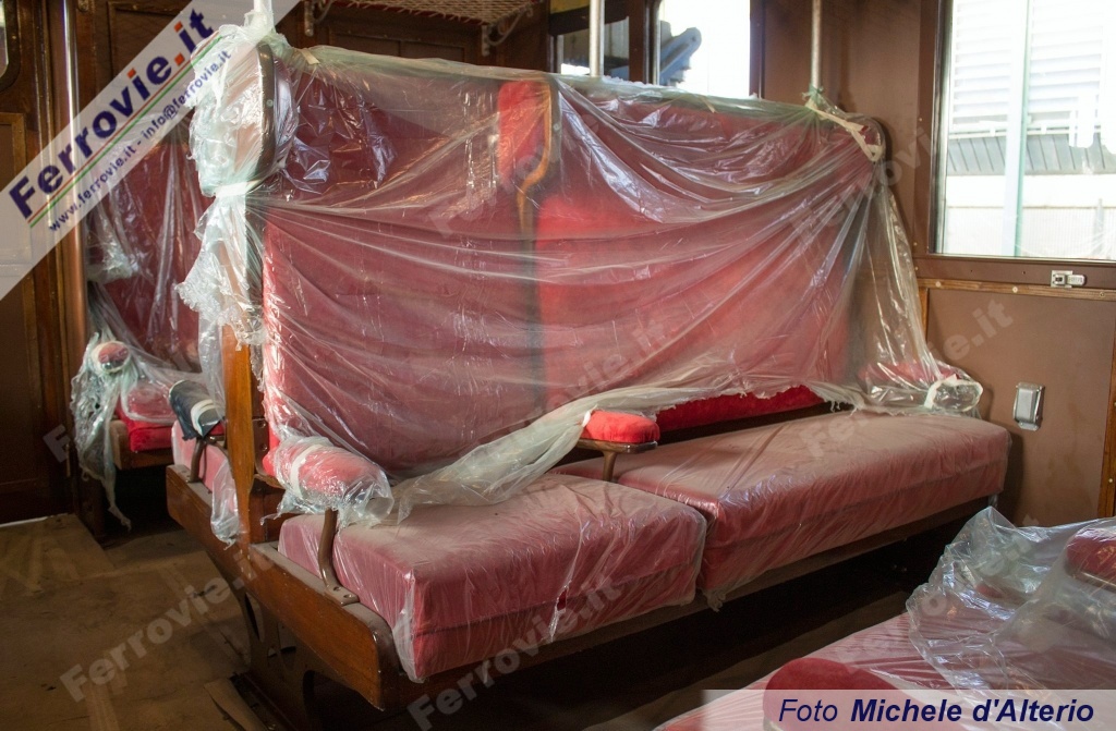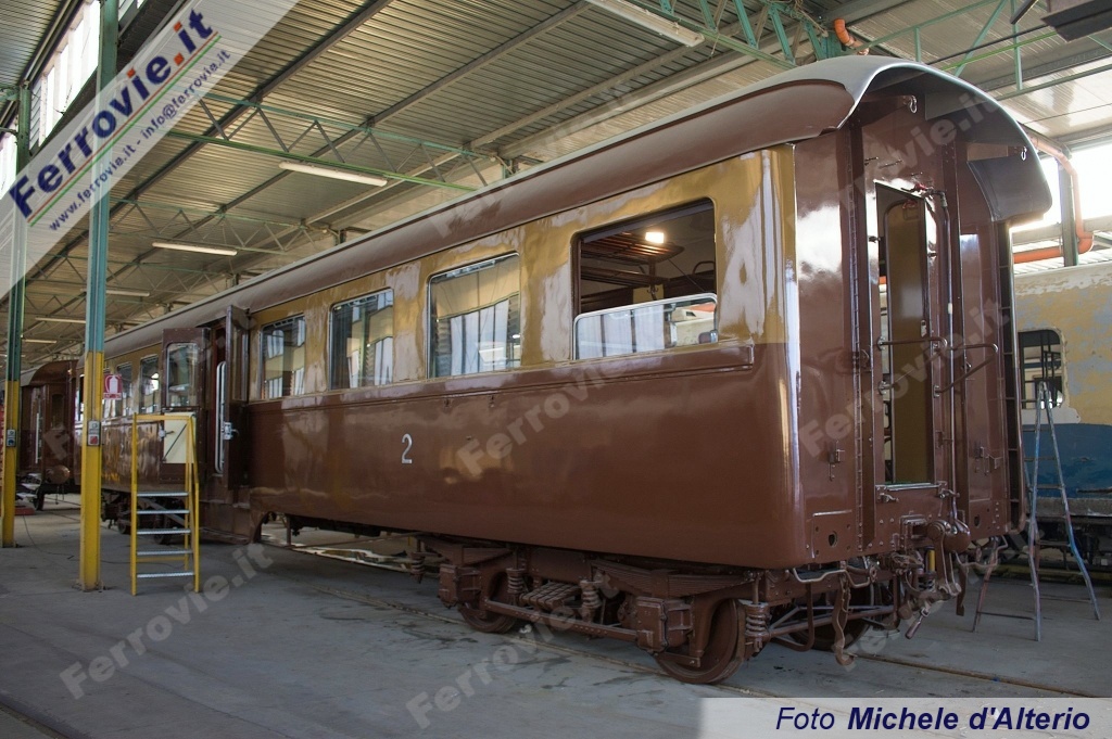 CANCELLO ARNONE (Caserta) - Si avvia a conclusione il restauro della carrozza mista Tipo 1936 e della Corbellini di SVF - Società Veneta Ferrovie. Il comune di Cismon con gara d'appalto ha ha affidato alla FD Costruzioni di Cancello Arnone la lavorazione completa delle due carrozze ABI 65000 e Bz 38.416, che ha interessato rodiggio, telaio, cassa, impianto elettrico ed arredi interni. Questi ultimi sono stati riportati allo stato d'origine con cappelliere, lampade per l'illuminazione e sedili, imbottiti e rivestiti in velluto rosso per la 1a classe (questi presenti solo nella Tipo 1936) e con panche in legno per la 2a classe. Esternamente la cassa ha ricevuto la livrea castano-Isabella, che si "sposa" coerentemente con la locomotiva 880.001 di SVF in lavorazione presso la Lucato Termica, dov'è stata trasferita per la revisione a metà novembre 2014 (vedi Treni storici del 20/11/2014).