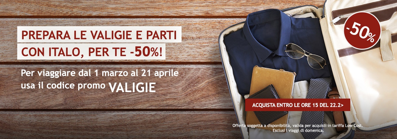 La promozione è valida per i viaggi effettuati nel periodo fra il 1° Marzo e il 21 Aprile1, in ambiente Smart, eXtra Large e Prima. Lo sconto è applicabile ai biglietti acquistati in offerta Low Cost.