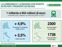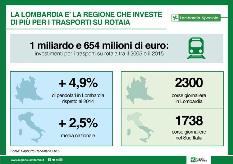 Il Governo lombardo è primo in Italia per i fondi stanziati per i trasporti su rotaia: tra il 2005 e il 2015 ha investito complessivamente 1 miliardo e 654 milioni di euro (874,5 milioni per i servizi e 779,7 per il materiale rotabile), di cui 640 milioni dal 2013 al 2015. E' quanto emerge dal Rapporto Pendolaria 2015 sui dati forniti da tutte le regioni italiane che utilizzano il servizio ferroviario.
