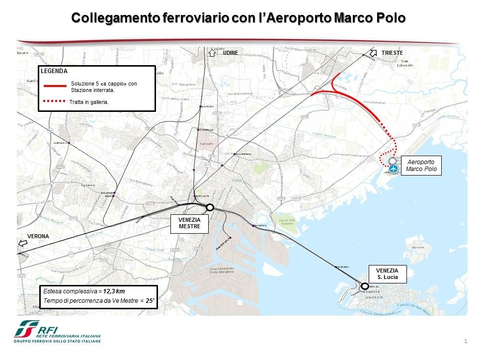 Parte la progettazione definitiva per il nuovo tracciato ferroviario che collegherà l'aeroporto Venezia Tessera Marco Polo con Mestre e Trieste e per la nuova stazione Venezia Aeroporto. La progettazione, elaborata da RFI, prevede anche lo Studio di impatto ambientale (SIA) e il Piano di utilizzo delle terre (PUT).