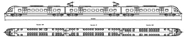 Il treno si presenta con due veicoli motorizzati con cabina di guida e una carrozza rimorchiata intermedia.