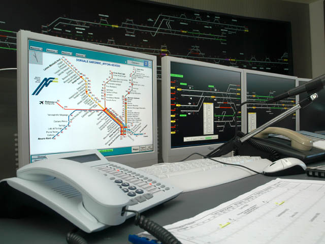 SARONNO (Varese) - Nel pomeriggio dello scorso 11 ottobre, Norberto Achille, Presidente del Gruppo Ferrovie Nord Milano, ha presentato alla stampa le nuove apparecchiature che costituiscono il Posto Centrale di Movimento (PCM) posizionato nella stazione di Saronno, in grado di governare in tempo reale la circolazione dei treni sulla rete sociale. Sul videowall, uno schermo di otto metri per uno e mezzo a sfondo nero, gli operatori possono visualizzare tutte le informazioni relative alla gestione delle linee e dei treni in viaggio: la posizione dei segnali e quella dei passaggi a livello, l'itinerario ed il numero dei convogli oltre alla loro esatta posizione sulla rete FNM.
