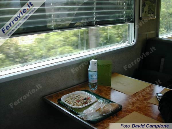 La scelta di piatti è stata ampliata, con l'inserimento di nuovi menù "stagionali", che offrono un elevato rapporto qualità/prezzo. Ed in effetti il pasto consumato nella carrozza ristorante, tra Latina e Roma mi lascia abbastanza soddisfatto: insalata di riso, scaloppina, acqua e caffè, per un totale di 16,10 Euro, anche se si avverte la mancanza di un servizio più curato...