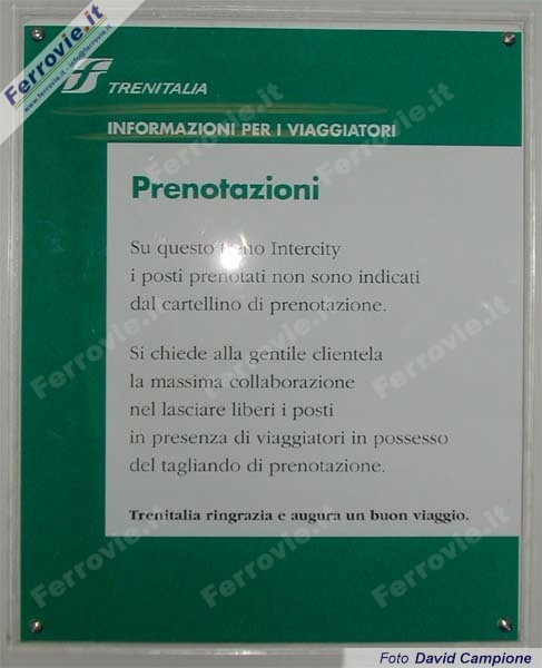 Non saranno più indicati i posti prenotati sulle nuove carrozze per treni Intercity. E' questa una delle novità, passata in secondo piano, delle nuove vetture Z e Gran Confort ristrutturate da Trenitalia, con i primi treni entrati in servizio Tra Udine/Trieste e Napoli. In ogni carrozza è affisso un cartello che invita i passeggeri senza prenotazione a collaborare per lasciare libero il posto a chi è provvisto di prenotazione. La novità sarà estesa anche agli altri Intercity in contemporanea con l'immissione in servizio delle nuove vetture restyling. Sarà l'antipasto della prenotazione obbligatoria anche su i treni IC? (Giancarlo Scolari)