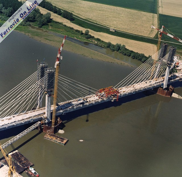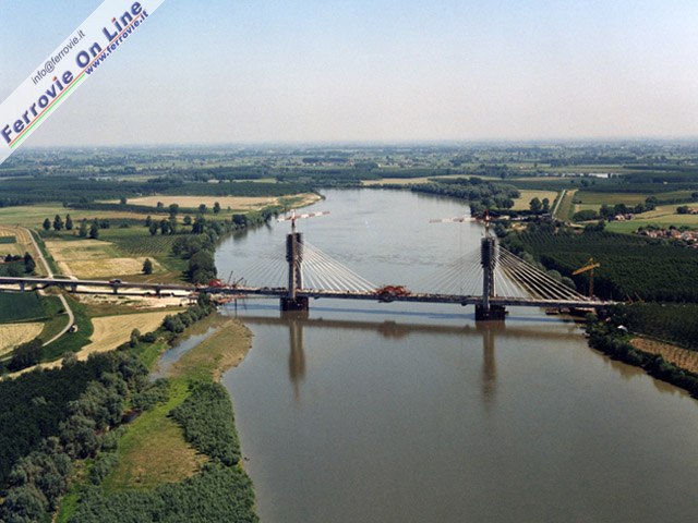 Lungo 400 metri, il nuovo ponte, ripartito in tre grandi campate e sospeso a poderosi cavi di acciaio, gli stralli, costituisce la parte centrale di un viadotto di 1400 metri con cui la linea ferroviaria Milano - Bologna scavalca gli argini maestri del grande fiume, nelle province di Lodi e Piacenza.