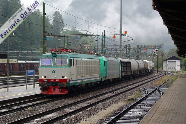 La E.652.052 è alla testa del convoglio che porta la E.483.001-4 verso sud, qui ripreso in transito da Fortezza. (Foto Fabio Veronesi, 14 ottobre 2006)