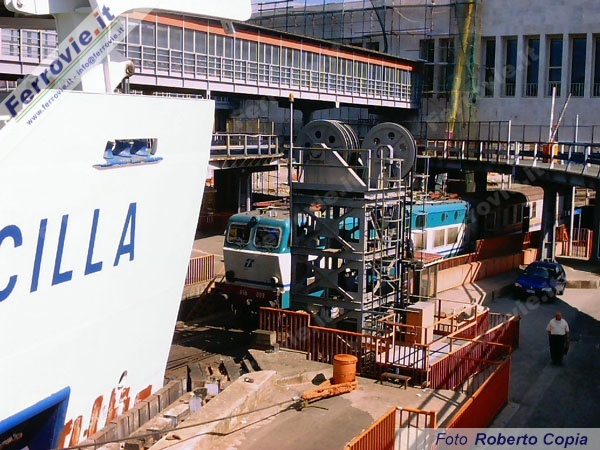 Giunto a Villa S. Giovanni, e dopo la partenza della sezione per Reggio Calabria, il convoglio viene "tagliato" (gergo con cui si indicano le operazioni di disconnessione del REC e chiusura delle passerelle intercomunicanti tra le vetture) nelle due sezioni per Palermo e Siracusa ed agganciato da una locomotiva D.145 del deposito di Reggio Calabria (con relativi carri scudo) a cui è affidata la manovra di imbarco sul traghetto.