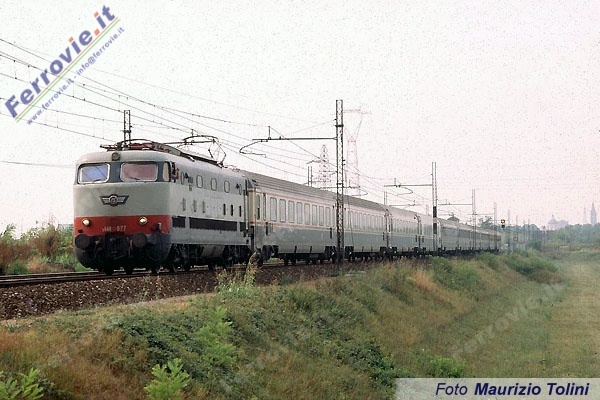 Da molto tempo, ormai, la meravigliosa livrea grigio e avorio ha lasciato il posto a quella XMPR che, assieme al recente avvio delle operazioni di revamping sta snaturando queste graditissime carrozze. Come sempre, però, per concludere questa rubrica preferiamo ricordarle nella loro veste più utilizzata al traino di uno dei più amati locomotori mai realizzati dalle FS. Con in testa la E.444.077 ben 4 vetture formano la prima classe di un elegante Intercity, per Milano in transito appena dopo il ponte sul Po di Piacenza. Fine anni '80. (Foto Maurizio Tolini)