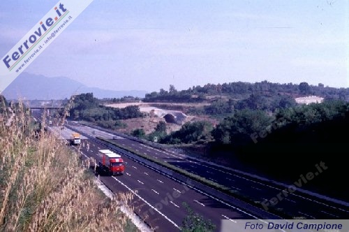 2. La futura linea ad alta velocità Napoli-Roma, correrà in molti punti vicino all'Autostrada del Sole che collega le due città. Qui un tratto dell'A1 presso Caianello, con in secondo piano il cantiere di una galleria della linea AV. (Foto David Campione, 02 settembre 1997)