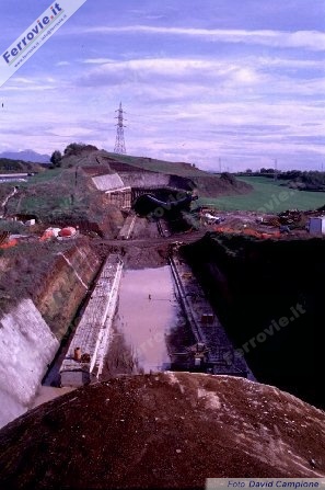 4. Cantiere della galleria Castello, composta da galleria in parte naturale ed in parte artificiale. La parte intermedia visibile nella foto tra i due portali, verrà infatti successivamente coperta artificialmente, realizzando un'unica galleria di 1.249 metri. (Foto David Campione, 31 ottobre 1997)