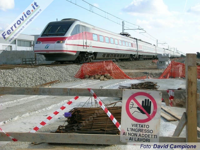 Mentre tra Lecce e Surbo il raddoppio è da tempo completato ed operativo, si sta lavorando tra Surbo e Trepuzzi, dove è ripreso in transito l'Eurostar 9354 per Roma, in prossimità di un sottopasso viario in costruzione. (Foto David Campione, 28 dicembre 2003)