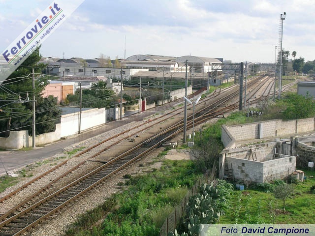 Vista dall'alto per la stazione di Trepuzzi. Il futuro binario pari sorgerà alla destra del binario di corsa, cioè andrà ad interessare il primo binario di stazione che attualmente si diparte dal primo deviatoio a destra nella foto. (Foto David Campione, 28 dicembre 2003)