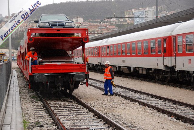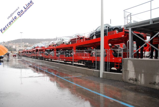 TRIESTE - Sono sbarcate lo scorso 2 aprile le prime auto provenienti dalla Germania al terminal DB di Trieste Centrale con il treno. Sotto una pioggia battente l'Espresso 13307 proveniente da Berlino è giunto con il suo carico di automobili e moto. Ad attendere il treno molti taccuini e telecamere e una banda musicale. Il materiale giunto nella città giuliana riparte immediatamente il pomeriggio.