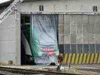 ATR 220-028 ricoverato in rimessa a Ferrara Porta Reno, con il frontale coperto da un telone di plastica che avrebbe la pretesa di proteggere il treno dalle attenzioni dei graffitari (peraltro, per fortuna, non particolarmente attivi presso questo impianto). Speriamo bene... (Foto Jacopo Fioravanti, 26 giugno 2009)