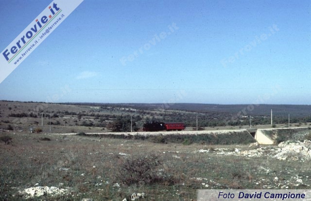 Locomotiva FCL 421 con una carrozza a due assi, in corsa presso Altamura, durante il trasferimento da Bari a Gravina per il collaudo di un ponte. (Foto David Campione, 9 novembre 1991)