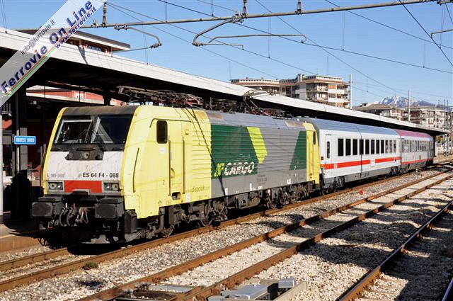 Breve convoglio composto dalla E.189.988 di NordCargo, una carrozza DB ed una OeBB, durante l'abilitazione ai rotabili di macchinisti e personale di scorta. (Foto Tg-trains.com, 3 novembre 2009)