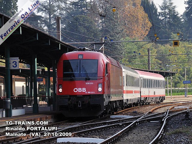 Altra protagonista delle prove, la E.190.011 Taurus di OeBB, in arrivo a Malnate con le due carrozze tedesca ed austriaca. (Foto Tg-trains.com, 27 ottobre 2009)