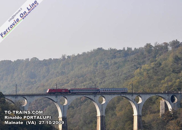 Lo spettacolare viadotto di Malnate assiste al transito di materiale rotabile internazionale, inusuale a questa longitudine. (Foto Tg-trains.com, 27 ottobre 2009)