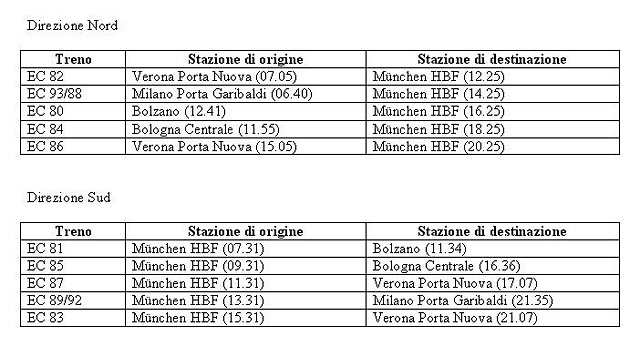 Cinque le coppie di EC in orario dal prossimo 13 dicembre: due Verona Porta Nuova - München, una Milano C.le - München, una Bologna C.le - München e una Bolzano - München. Molto aggressiva l'offerta commerciale con biglietti a partire da 19 euro in seconda classe e 29 in prima mentre per le tratte italiane non sarà possibile salire a bordo con il biglietto di Trenitalia.