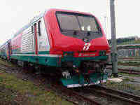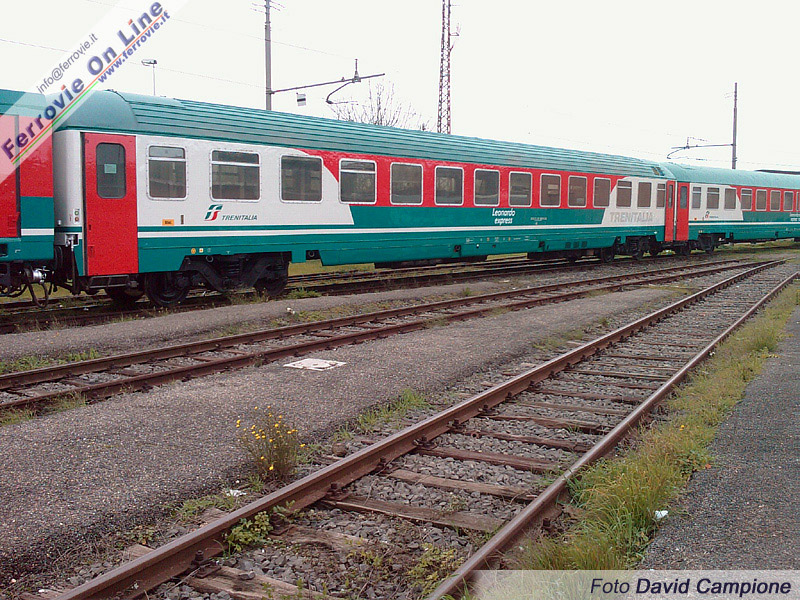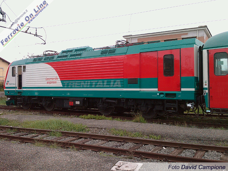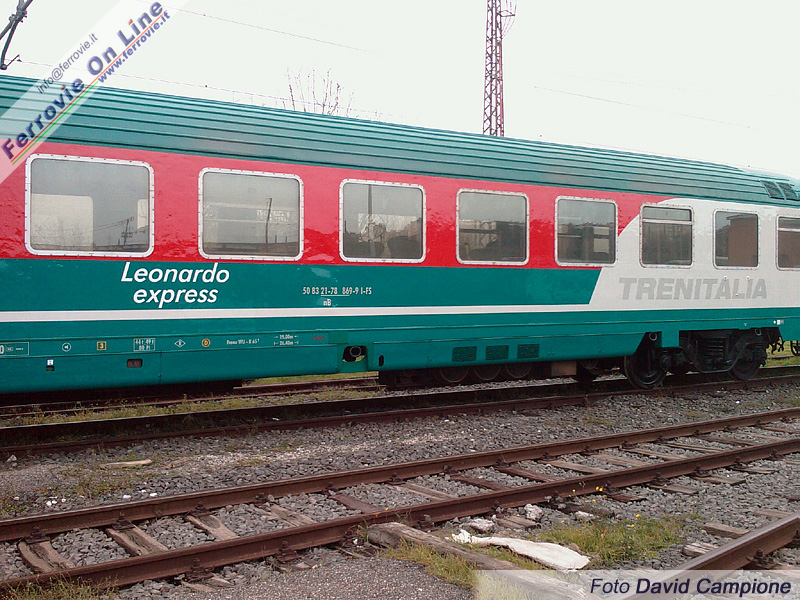 Sulle fiancate campeggia l'abituale logo FS, la scritta Leonardo Express ed ancora un'inedita e vistosa scritta TRENITALIA.
