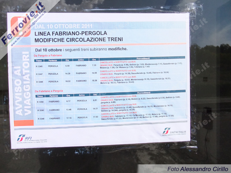 PERGOLA (Pesaro-Urbino) - Probabilmente la data dell'otto ottobre 2011 ha segnato la parola "fine" per la Pergola - Fabriano. Il comunicato ufficiale parla di sospensione del servizio ferroviario per manutenzione al materiale rotabile, ma complici alcuni esempi recenti, e il fatto che on-line la sospensione è annunciata per tutta la validità dell'orario corrente, mentre l'avviso affisso nelle stazioni espone semplicemente la data di sospensione del servizio, il timore che la sospensione abbia carattere definitivo è ben più che una semplice paura.