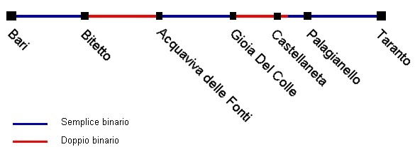 E' stata aperta all'esercizio nella notte tra il 14 ed il 15 settembre la nuova tratta Gioia del Colle - Castellaneta della ferrovia Bari - Taranto, linea per la quale è previsto il raddoppio e la rettifica dell'intero tracciato, in parte già eseguito come indicato nello schema di sotto.