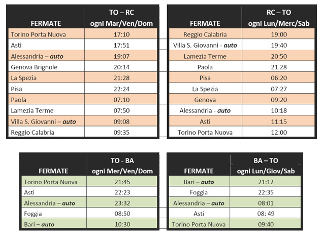 I treni per il sud Italia partiranno dalla stazione di Torino Porta Nuova e avranno cadenza trisettimanale ogni martedì, venerdì e domenica da Torino verso Reggio Calabria e ogni mercoledì, venerdì e domenica verso Bari; viceversa ogni lunedì, mercoledì e sabato da Reggio Calabria verso Torino e ogni lunedì, giovedì e sabato da Bari.