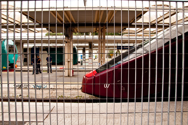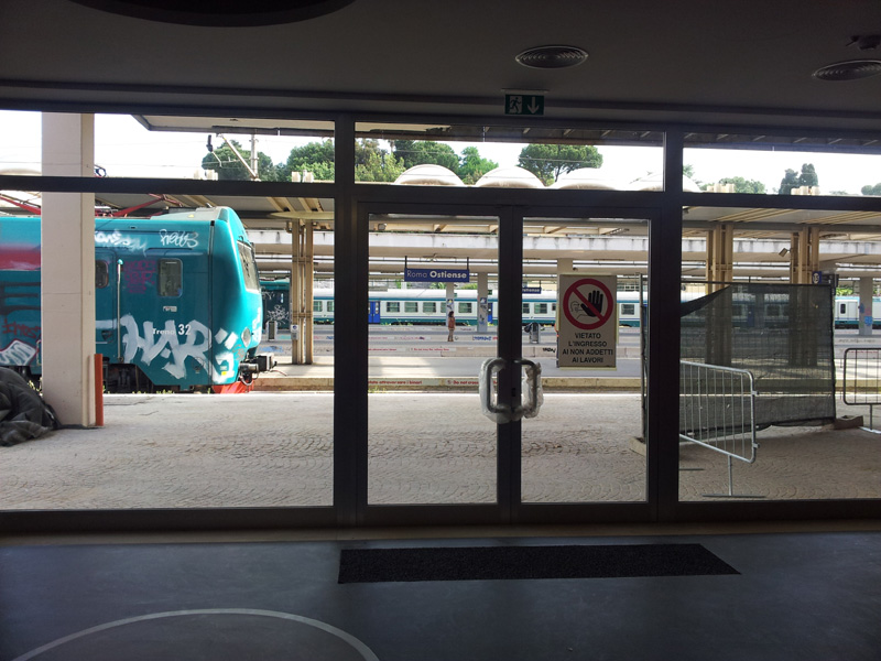 Poi l'attenzione si sposta su Ostiense, dove Nuovo Trasporto Viaggiatori ricorda che "una ridicola gabbia imprigiona i viaggiatori, costringendoli ad un'assurda ed insicura gimkana per raggiungere i binari", come testimonia una foto scattata durante l'allestimento di Casa Italo.