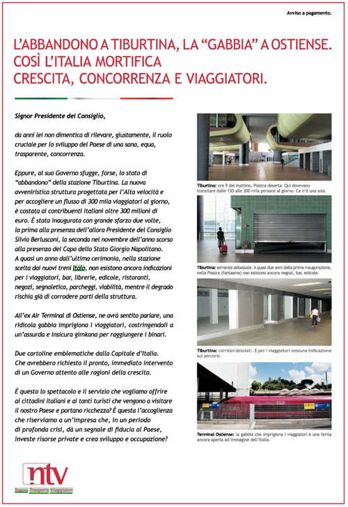ROMA - Non accenna a placarsi il batti e ribatti tra il gruppo FS e NTV. Lunedì 9 luglio l'impresa ferroviaria di Montezemolo e Della Valle ha acquistato una pagina sul quotidiano La Repubblica, per significare lo stato di abbandono in cui versa la nuova stazione Tiburtina, nonché la "gabbia" di Roma Ostiense che non consente il passaggio diretto da Casa Italo ai treni di NTV, ancora lì ad un mese dall'inaugurazione del centro servizi presso l'ex Air-terminal.