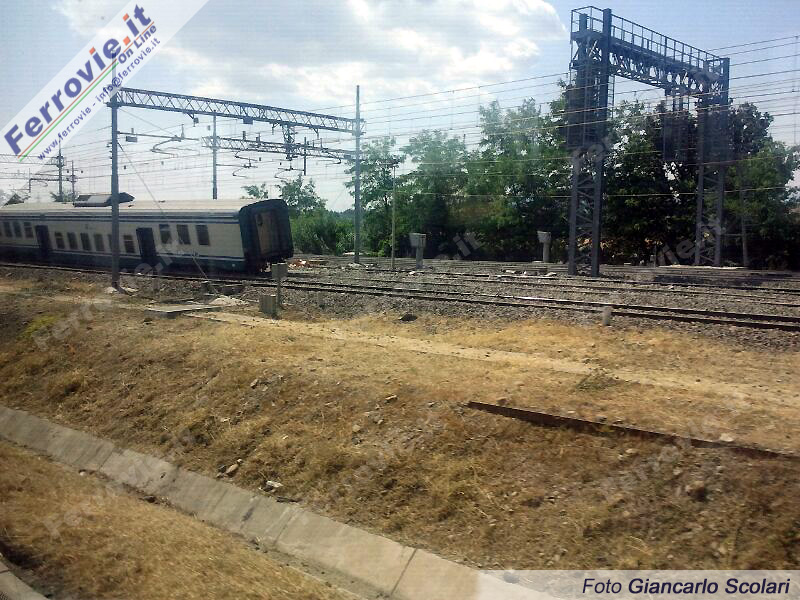 LAVINO (Bologna) - Incidente ferroviario nella stazione di Lavino di Mezzo. Alle 9.30 di questa mattina il treno Regionale Voghera - Rimini 2885 è deragliato nell'ambito della stazione emiliana. Il convoglio, composto da una locomotiva E.464 e sei carrozze a Piano Ribassato, si è adagiato su un fianco.