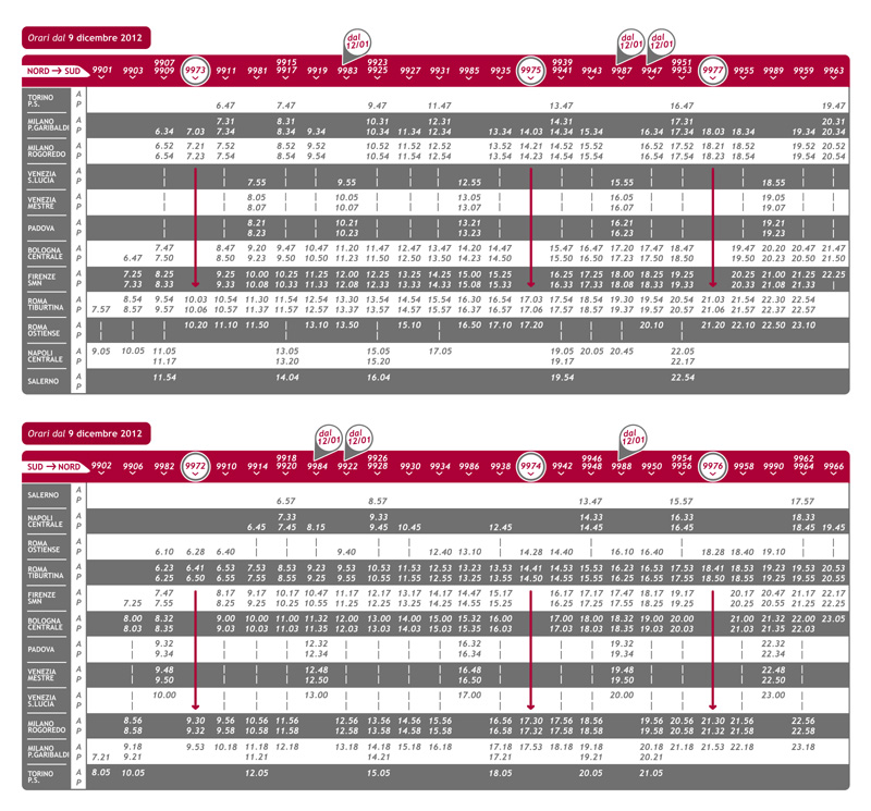 Il primo treno in partenza da Torino è programmato alle 6.47 con destinazione finale Roma. L'ultimo, per Roma - Napoli - Salerno è previsto alle 16.47. Alle 19.47 parte invece l'ultimo Italo per Firenze.