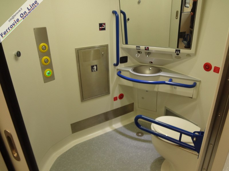 I servizi igienici sono ampi ed accessibili ai disabili: apertura, blocco ed altre azioni sono comandati da pulsanti a pressione illuminati; non mancano ganci portaoggetti ed un fasciatoio a ribalta.