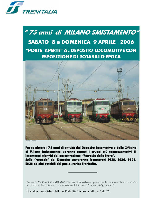 MILANO - Sabato 8 e domenica 9 aprile 2006 si svolgerà una manifestazione per festeggiare il settantacinquesimo compleanno dell'impianto di Milano Smistamento, dotato di deposito, officina e scalo ferroviario, realizzato negli anni Trenta in concomitanza con la stazione di Milano Centrale. Per l'occasione Trenitalia ed il MERS, con il concreto aiuto di associazioni e gruppi di volontari, quale il neonato "Gruppo Livree Storiche Milano Smistamento", organizzano una giornata porte aperte al deposito locomotive con esposizione di rotabili d'epoca dei gruppi più rappresentativi del parco trazione delle nostre Ferrovie dello Stato. Pezzo forte della manifestazione sarà una eccezionale parata sui binari della rotonda, che vedrà protagoniste alcune unità dei gruppi E.424, E.428, E.626, E.636 ed E.645 provenienti da vari impianti d'Italia. Oltre a queste saranno presenti la locomotiva a vapore 625.177, l'elettromotrice ALe 883 ed il rimorchio Le 883 recentemente restaurati presso l'officina di Cremona, la E.636.284 "Camilla" ed altri rotabili di notevole interesse.