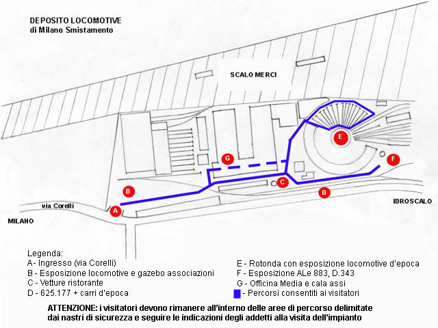 Per partecipare all'evento è necessario prenotarsi inviando una e-mail all'indirizzo exposmista@yahoo.it e sottoscrivere un'apposita dichiarazione liberatoria che verrà consegnata all'ingresso dell'impianto. L'accesso sarà consentito dall'ingresso di via Corelli 61, secondo il seguente orario: dalle ore 13 alle ore 18 di sabato 8 aprile e dalle ore 9 alle ore 17 di domenica 9 aprile. All'interno dell'impianto i visitatori potranno seguire differenti percorsi che li guideranno nello storico deposito: dall'officina media con il cala-assi alla piattaforma girevole con la parata sulla rotonda fino ad assistere a manovre d'altri tempi con la arzilla 625.177 ed alcuni carri d'epoca. Al fine della migliore riuscita della manifestazione, gli organizzatori richiedono la massima collaborazione da parte dei visitatori che dovranno rimanere all'interno dei percorsi delimitati e seguire le indicazioni del personale e dei volontari presenti. Buon compleanno Milano Smistamento!
