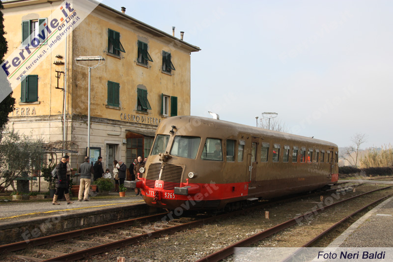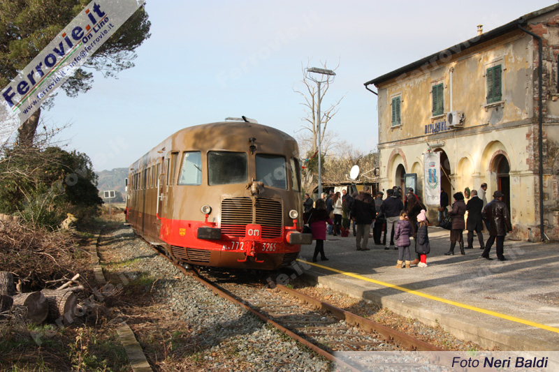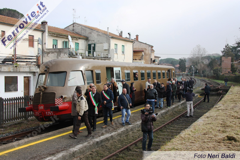 CECINA (Livorno) - Cerimonia in pompa magna per la riapertura della linea Cecina - Saline di Volterra, chiusa da alcuni mesi dopo alcuni lavori di manutenzione dell'armamento e di ripulitura della sede ferroviaria. Il treno inaugurale, alla presenza del governatore della Regione Toscana Enrico Rossi e dell'assessore regionale alle Infrastrutture Vincenzo Ceccarelli, è stato effettuato dall'automotrice storica ALn 772.3265 ed ha sostato in tutte le stazioni della linea prima di giungere al capolinea di Saline di Volterra.