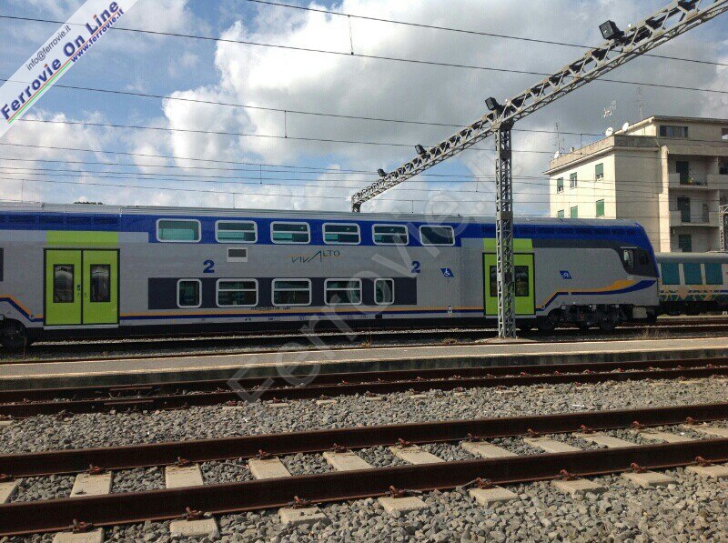 ROMA - Si presentano così le carrozze Vivalto nella la nuova livrea Trenitalia per la DTR - Divisione Trasporto Regionale. Il primo convoglio con la E.464.589 che ha ricevuto i nuovi colori (svelati a Savigliano lo scorso 26 giugno - vedi News ferroviarie del 26/06/2013), si trova a Roma Smistamento in attesa della presentazione alla stampa congiuntamente al primo ETR.425 di Alstom, inizialmente prevista per il 26 febbraio ma rinviata a nuova data.