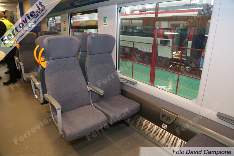 I sedili sono rivestiti in stoffa (blu in seconda classe, grigio per la prima), che non fa rimpiangere la plastica blu prescelta da Trenitalia per i Jazz e per tutti i treni del Trasporto Regionale in flotta.