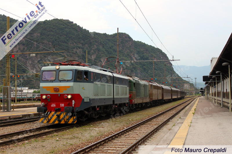 BOLZANO - Atmosferà retrò a Bolzano. Nel capoluogo altoatesino l'11 giugno è giunto un convoglio storico partito dalla Squadra Rialzo di Milano. L'Invio 2099B/74156 aveva come titolare la E.656.590 seguita dalla D.445.1006, dalla E.645.023, da cinque carrozze: Az 10062, AZ 21106, Bz 32153 e due Centoporte Cz 36289 e Cz 37249.