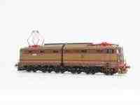 Locomotiva Elettrica E.645.049 delle FS, livrea castano/isabella con fregio rosso. Vetri Triplex, pantografi 52 con strisciante piano, senza sabbiere intermedie. Epoca Va. Deposito Locomotive Milano Sm.