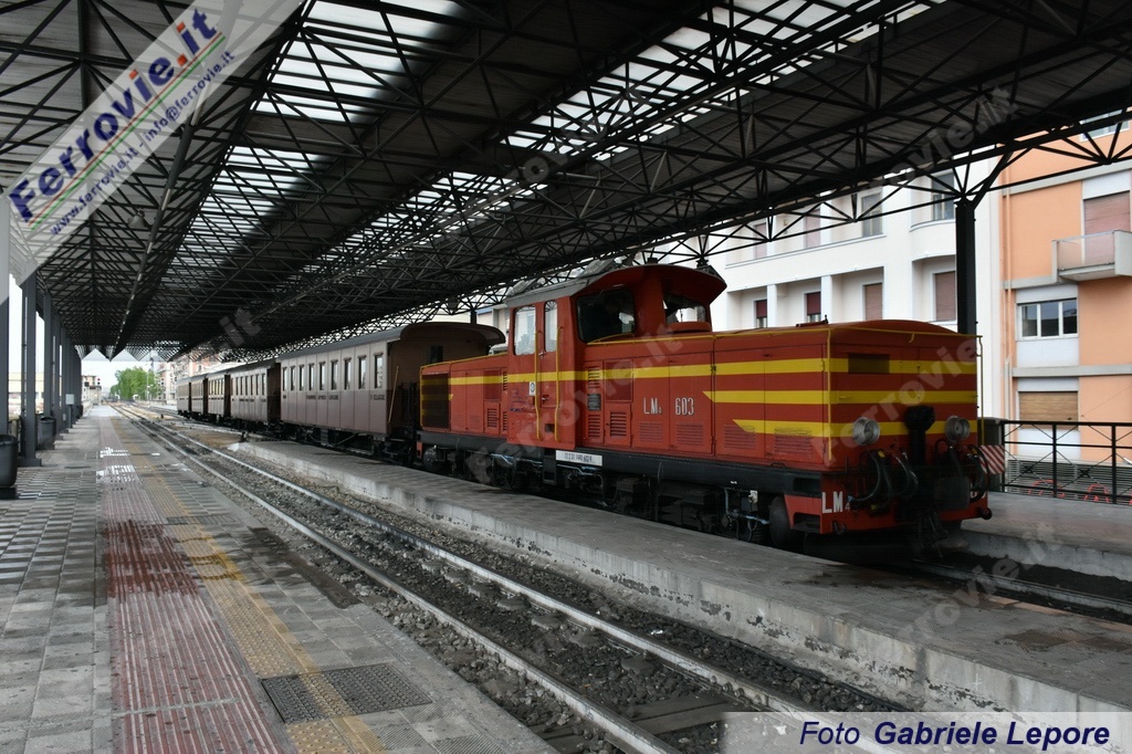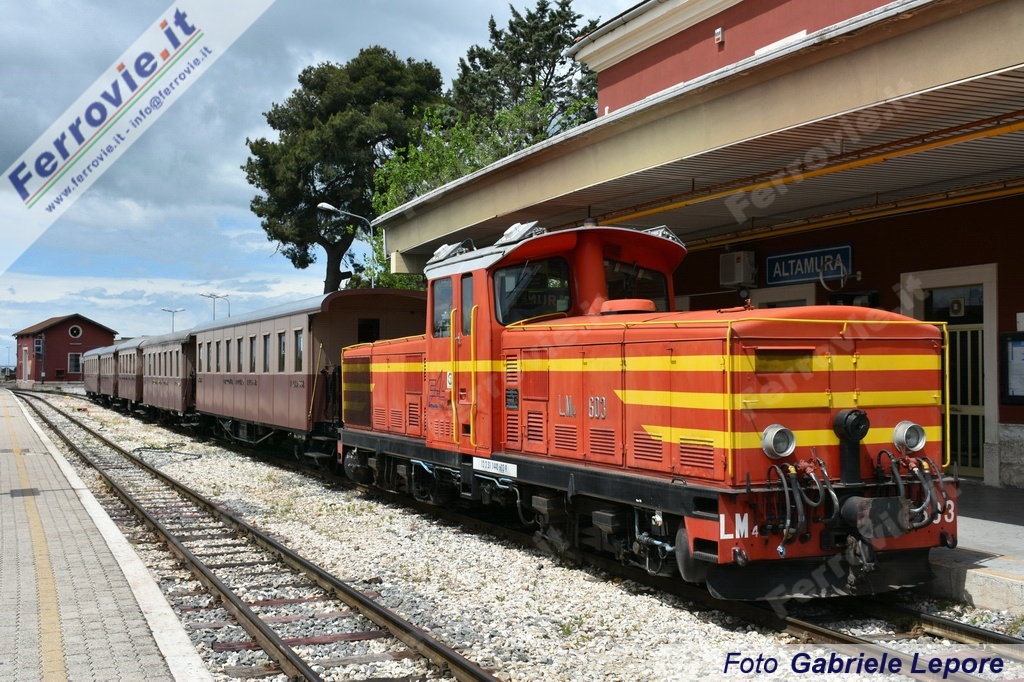 Titolare del Murgia Express in questa circostanza è stata la locomotiva Diesel LM4.603 in livrea rossa con fasce giallo taxi, costruita da Ferrosud nel 1975 con motore e trasmissione Isotta Fraschini-Breda. A seguire, cinque carrozze a terrazzini Carminati & Toselli in livrea castano/isabella, tutte risalenti al 1915 ma con rimaneggiamenti e implementazioni successive: le vetture Acmr 3251 e Bcmr 3103 con allestimenti di prima classe; le vetture Bcmr 3109, Bcmr 3412 e Bcmr 3459 con allestimenti di seconda classe. Durante il viaggio, il convoglio è stato costantemente preceduto dall'automotrice Fiat M4.308, pronta a intervenire come unità trainante di riserva in caso di richiesta di soccorso.
