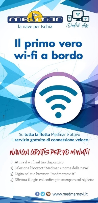 Da oggi sulle navi della flotta Medmar c'è un servizio in più: la connessione Wi-Fi a bordo, con 90 minuti di navigazione internet gratuiti. Un benefit per tutti i clienti, più di un milione e mezzo ogni anno, che scelgono di viaggiare con Medmar che è il vettore marittimo più importante per l'isola d'Ischia.