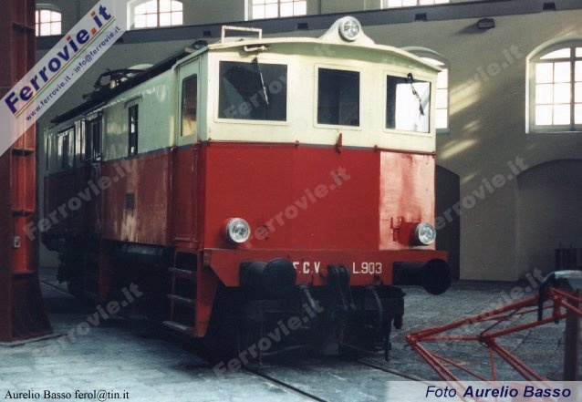 Locomotore L.903 della Ferrovia Casalecchio - Vignola in esposizione nel Museo Ferroviario di Pietrarsa. Inizialmente questo locomotore appartenne al gruppo E1-E3, costituito da sole 3 unità, appositamente progettate e costruite tra il 1928 ed il 1930 per la Ferrovia Aosta - Prè Saint Didier (FAP). Nel 1931, con l'accorpamento della FAP da parte delle FS, queste 3 macchine originariamente di coloritura nera, ricevettero la nuova classificazione E.400 FS e la livrea isabella. Nel 1971 le E.400 furono cedute alla FCV - Ferrovia Casalecchio Vignola, dove furono ancora una volta riclassificate e riverniciate adottando lo schema di coloritura crema e rosso vermiglio. (Foto Aurelio Basso, 30 marzo 1992)