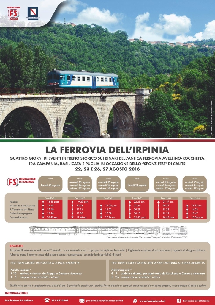 Fondazione FS ha diffuso il programma con gli orari del treno storico che viaggerà tra Foggia e Conza, in occasione dello "Sponz Fest" di Calitri.