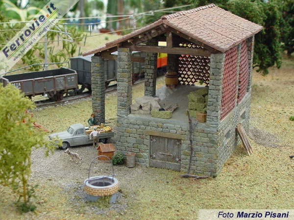 L'armamento (binari e scambi) è Peco (cod. 75) mentre tutto il resto è completamente autocostruito. Pali e portali sono realizzati in tubo e filo di ottone, la linea aerea è costruita con filo di ottone opportunamente sagomato e saldato, gli alberi sono ottenuti da rametti di erica ed altre piante naturali colorati con polveri di diverse tonalita'. La palizzata presente sul diorama è in parte Rivarossi ed in parte autocostruita, per fusione, in metallo bianco. Il diorama è stato successivamente animato con figurine e automodelli rielaborati di varia provenienza.