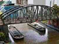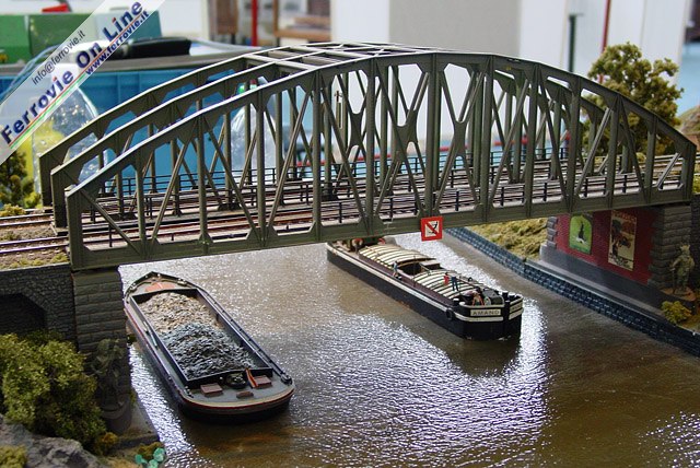 All'interno della Fiera, ampio spazio era dedicato ad un plastico modulare realizzato da gruppi provenienti da diverse nazioni europee. Nell'immagine, un modulo riproducente un canale navigabile percorso da due chiatte, scavalcato da una linea ferroviaria a doppio binario.