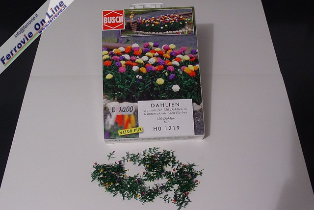 2. L'articolo Busch 1219 Dahlien con le 120 piante già assemblate dall'autore mediante incollaggio del fiore sul gambo e piegatura delle foglie per ottenere una disposizione più veritiera.