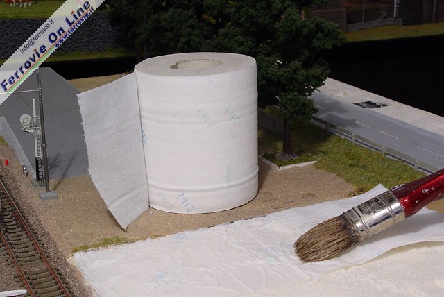 7. Si inizia poi la realizzazione della base dell'orto, applicando carta igienica spennellata con colla vinilica diluita in acqua. Dopo aver ricoperto tutta la superficie, si attende l'asciugatura. (Foto Fabio Veronesi)