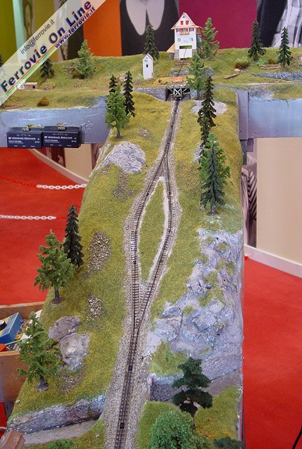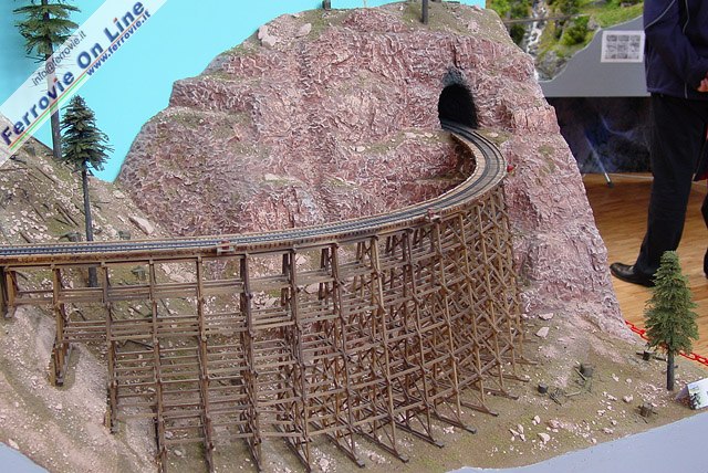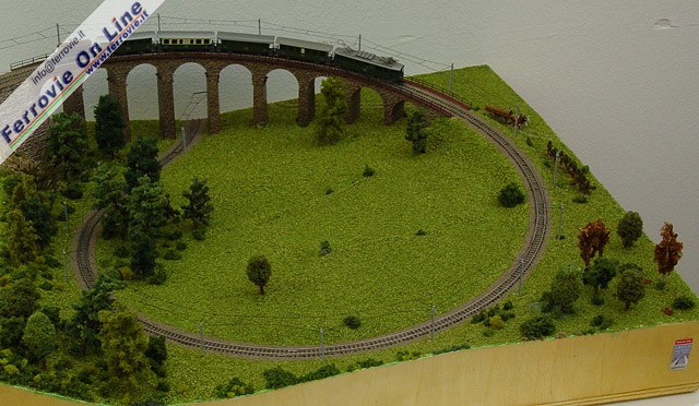 13. Brusio Bernina, opera di Silvio Carcano, Milano. Il diorama riproduce in scala Nm il famoso viadotto elicoidale di Brusio, sulla linea Tirano - St. Moritz delle RhB. La struttura del ponte è di cartoncino ricoperto con carta pietra commerciale; le pietre che simulano l'arco sono state tagliate una ad una ed incollate singolarmente con infinita pazienza. La linea aerea riproduce esattamente quella reale con la tipica catenaria montata quasi orizzontalmente; sono stati usati profilati di ottone ad H e filo di cotone. (Foto Fabio Veronesi, 8 novembre 2008)