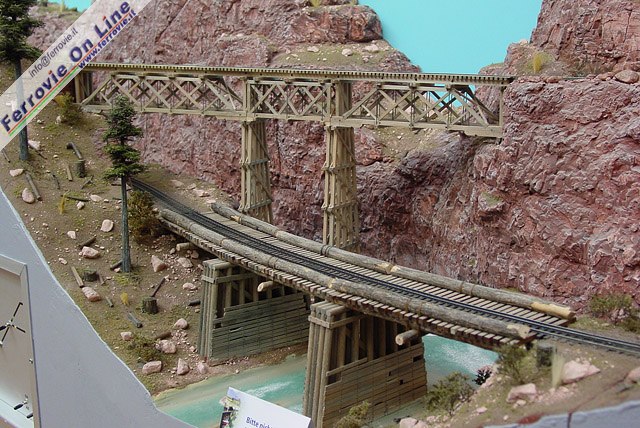 7. ... Il plastico è diviso in due parti e obbliga così l'osservatore a fare un giro intorno ad esso: la linea ha inizio nella stazione dotata interamente di binario a doppio scartamento della ditta Shinohara Cod. 70 (scartamento normale e H0n3). La linea a doppio scartamento prosegue lungo un dirupo passando diversi ponti (tutti interamente autocostruiti) continuando poi dall'altra parte in scartamento normale. Su questa parte si trova la ferrovia di deforestazione (logging railroad) che passando due tornanti arriva alla stazione capolinea con il "logging camp" (campo dei boscaioli)... (Foto Fabio Veronesi, 8 novembre 2008)
