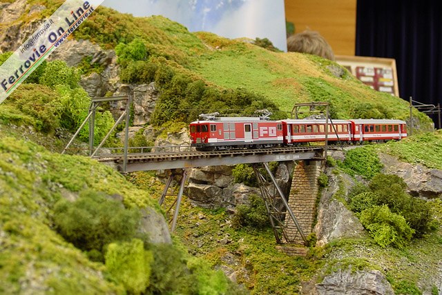 14. RhB e Furka, opera di Rino Danzico, Verona. Il plastico, in scala Nm, rappresenta una tipica linea svizzera a scartamento ridotto con vari ponti e salite/discese. Per l'armamento è stato utilizzato materiale in scala Z della Märklin, scartamento 6,5 mm. La linea aerea è prodotta dalla ditta Sommerfeldt. (Foto Fabio Veronesi, 8 novembre 2008)